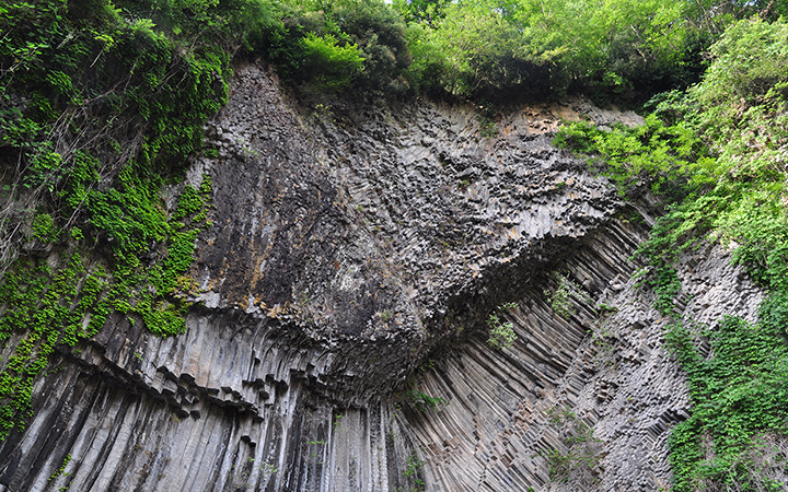 玄武洞公園已被指定為日本天然紀念物。這裡是160萬年前火山噴發時熔岩流經的位置,熔岩冷卻後,就形成了六邊形的岩柱。現場有提供導覽(請先於豐岡觀光協會預約)。 近距離觀賞壯觀的岩壁。